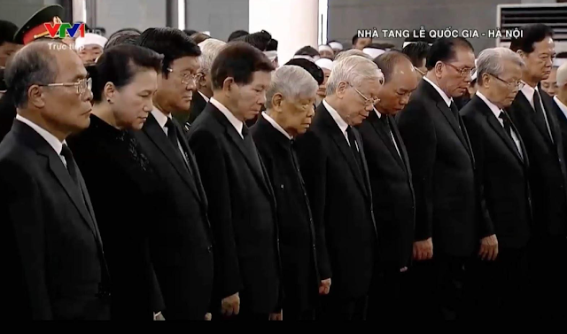 Những tội đồ đang hớn hở vì vừa mất bớt một địch thủ, nhưng đóng kịch gục mặt nhân dịp tiễn đưa một đồng bọn là Trần Đại Quang về theo bác (Ảnh: Dân Làm Báo)